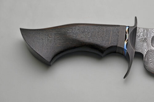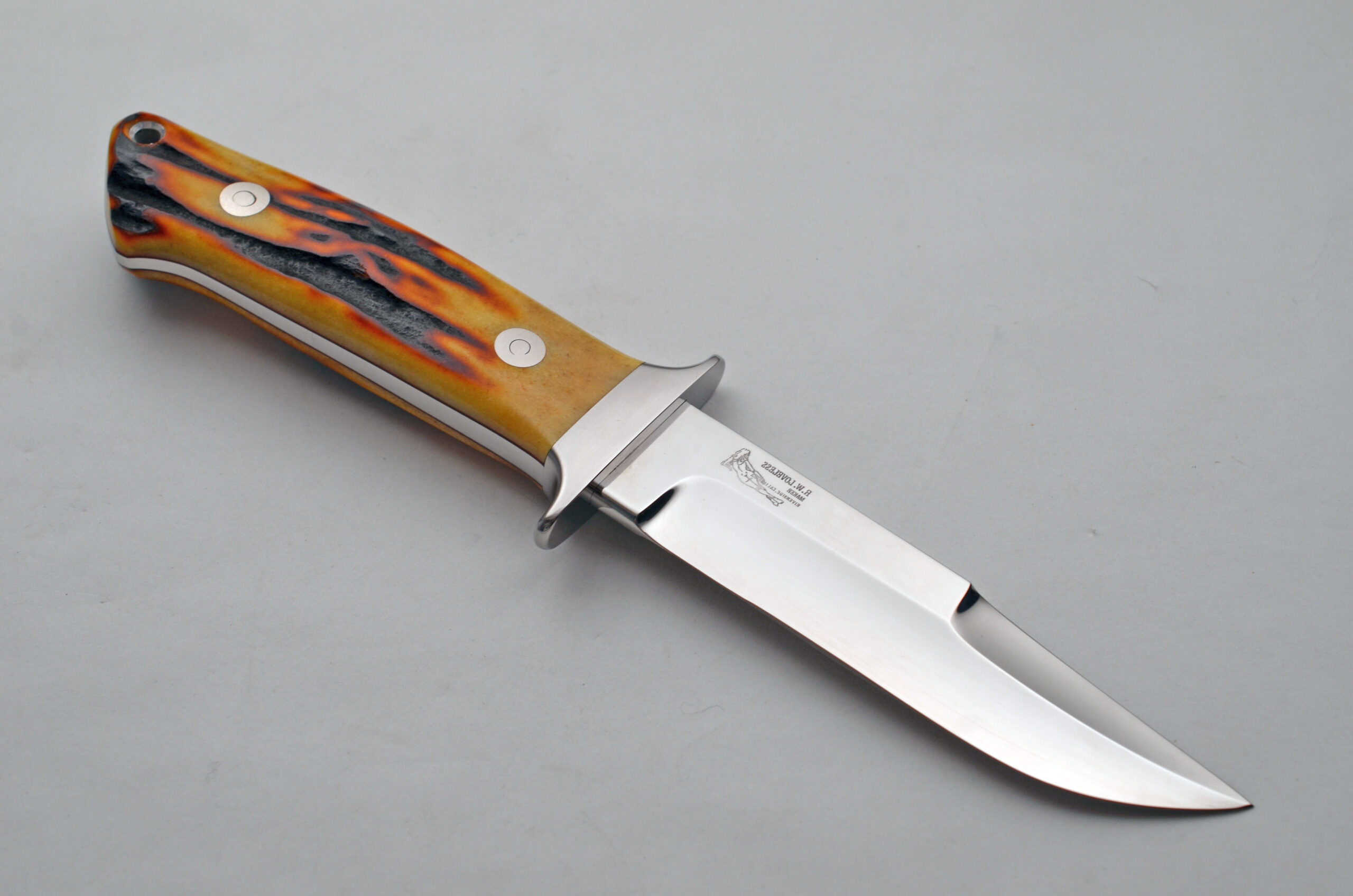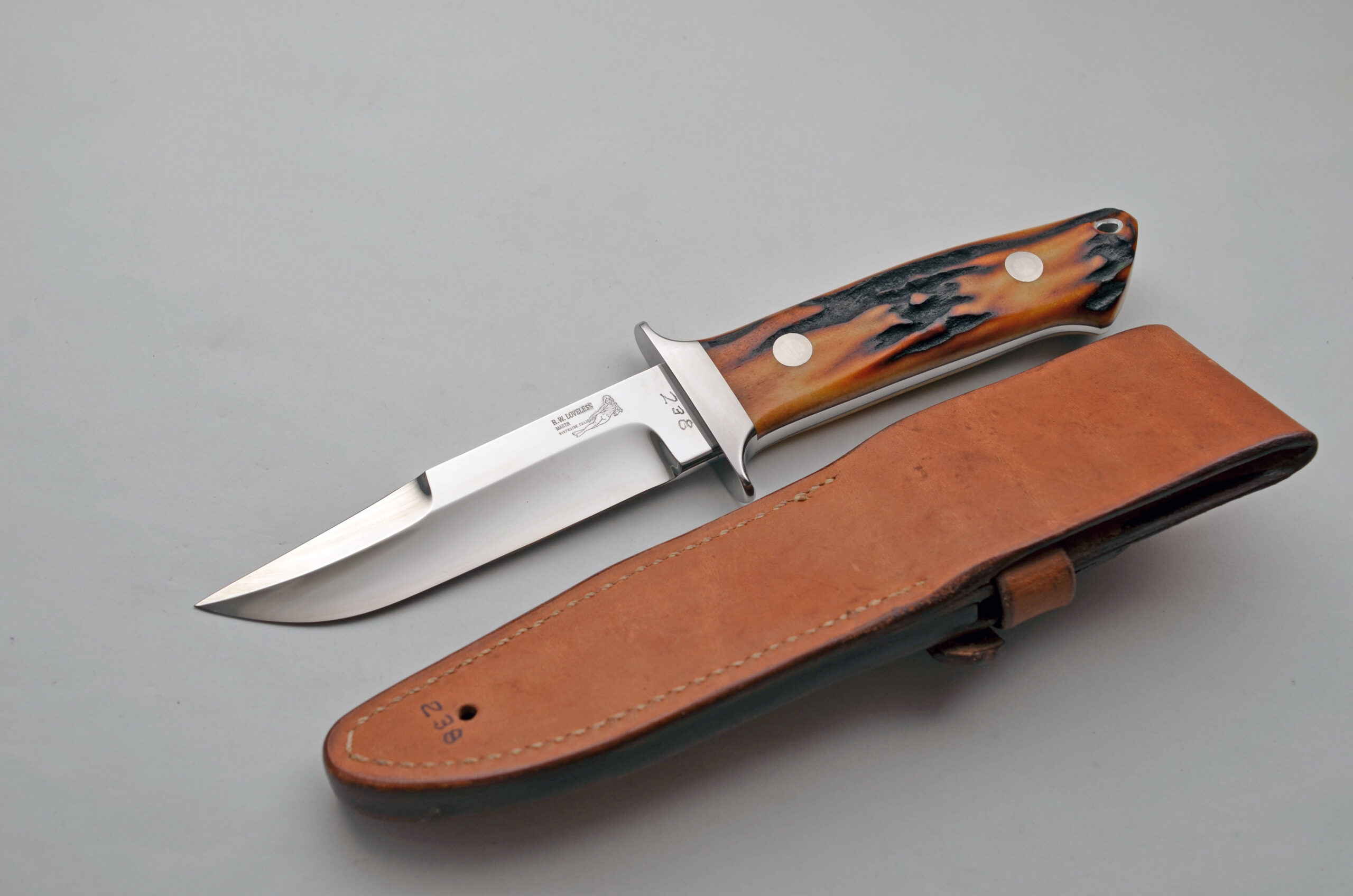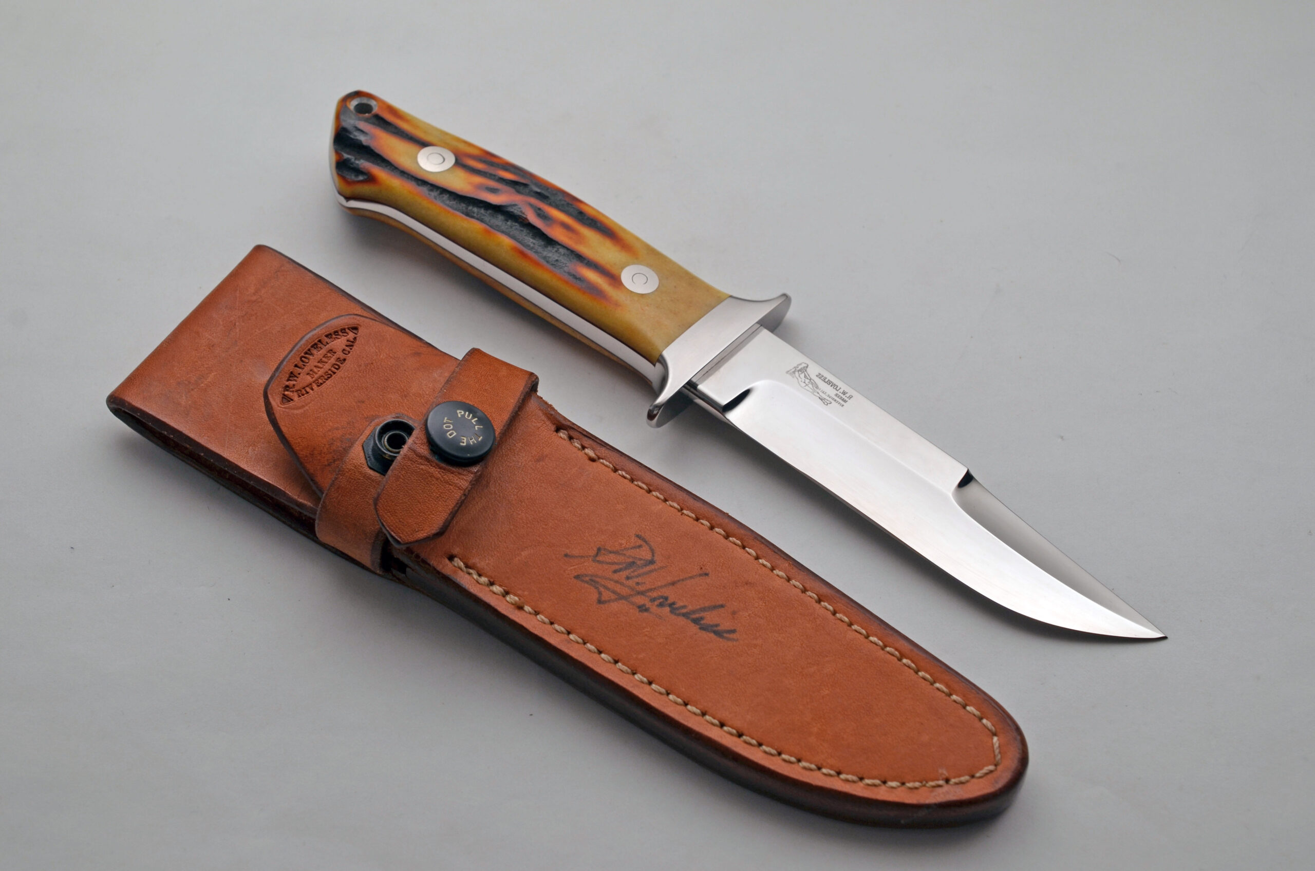Exquisiteknives.com is proud to offer this magnificent example of an Amber Stag Chute Knife.  Of all of the knives that Bob and Jimmy made, the Chute Knife is perhaps the most coveted.  The expertly ground and finished blade is approx. 4.5″, OAL is approx. 9″.  A stainless Steel Hilt blend’s seamlessly with the presentation grade, Sambar Stag, Amber Scales.  Loveless Bolts do not mar the beauty or thickness of these scales as the shop was kind enough to leave a lot of the beautiful bark!