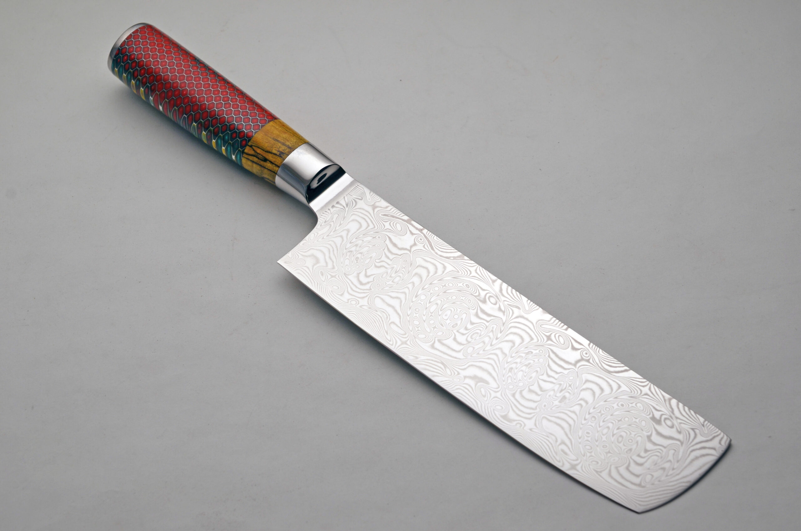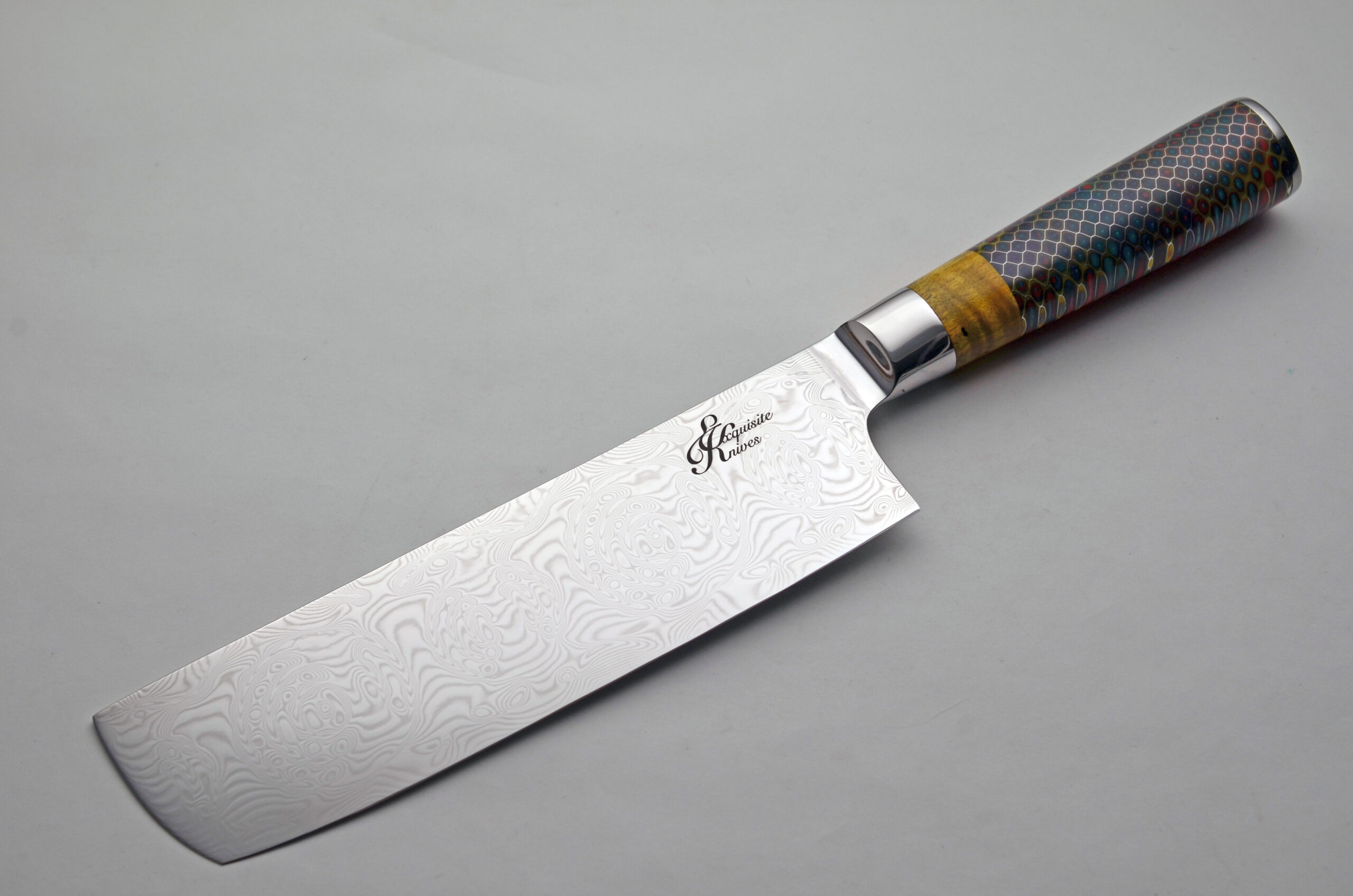 I have been searching for more Nikiri style Knives to add to the Exquisiteknives.com collection. These beauties fit the bill nicely! The cleaver style Damascus Blade is approx. 7″, OAL is approx. 11.75″. The composite handle is not only lovely but feels great, even when wet. Integral bolster lends itself to the pinch grip. Ships in a Fitted Box.