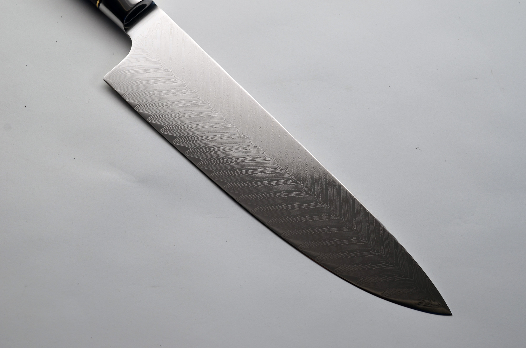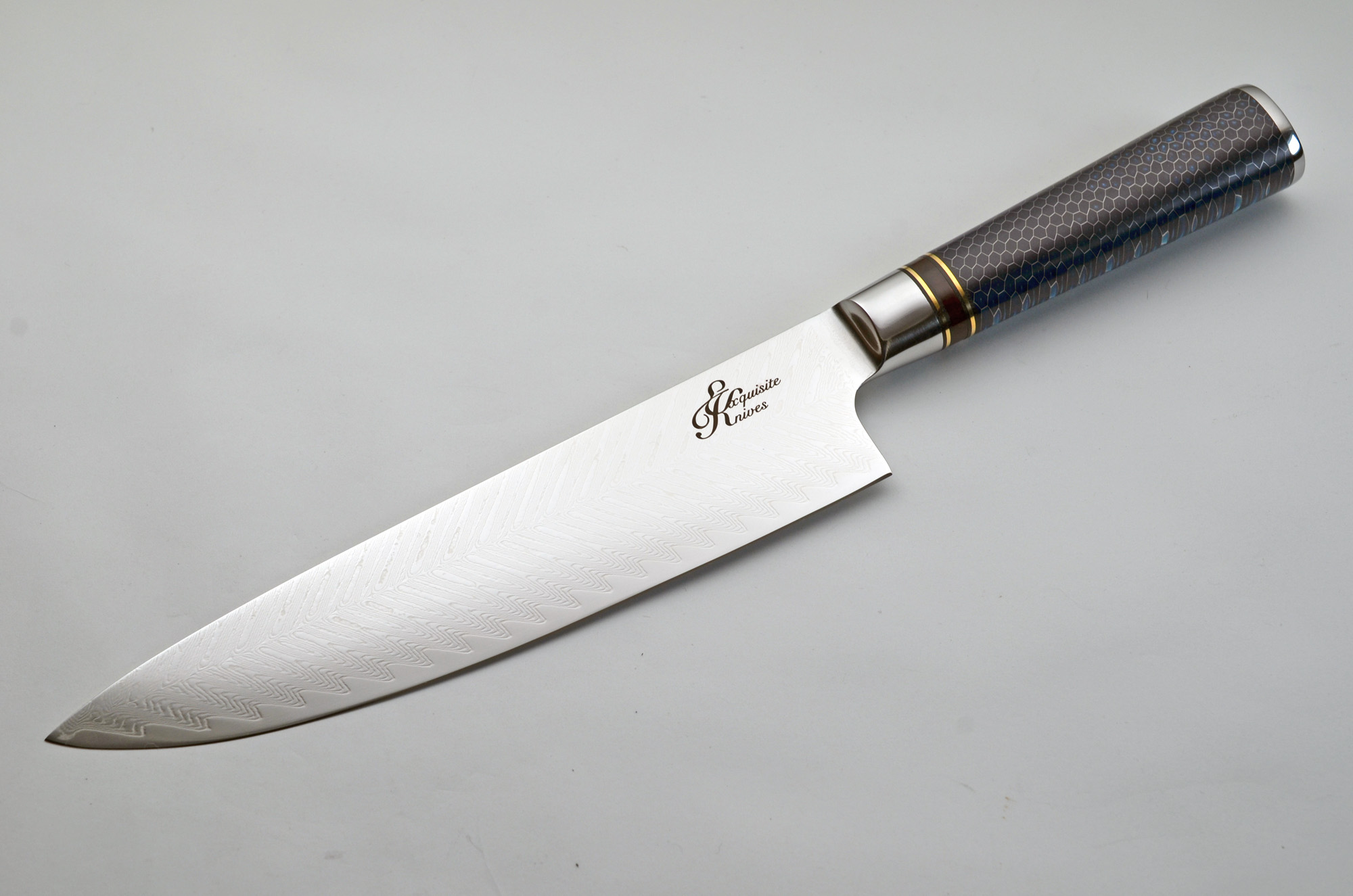 8″ San-Mai Blade of Feather Damascus. Beautiful impregnated geometric handle with decorative spacers. Approx. 13″ OAL. Balance perfectly and razor sharp!