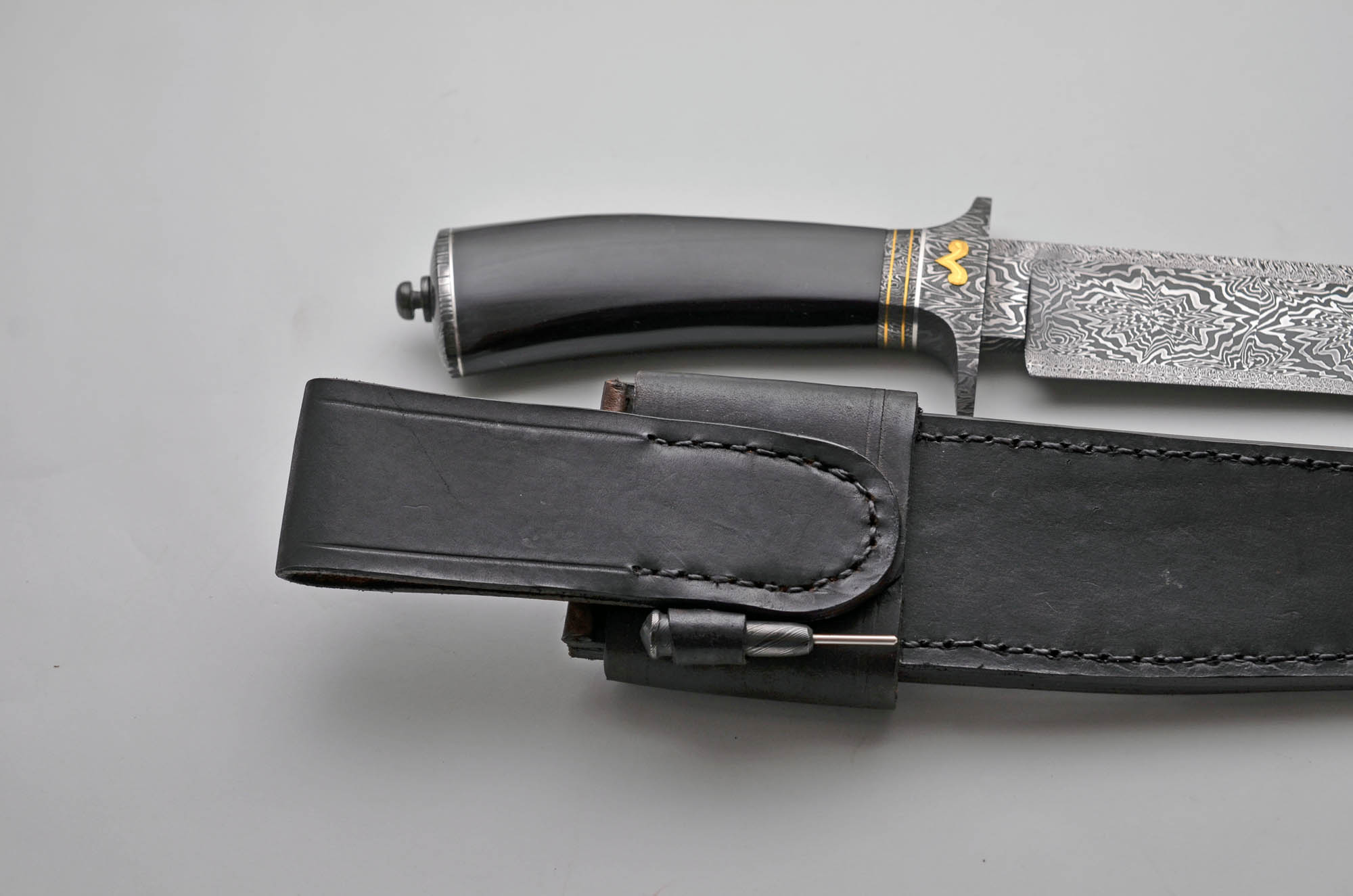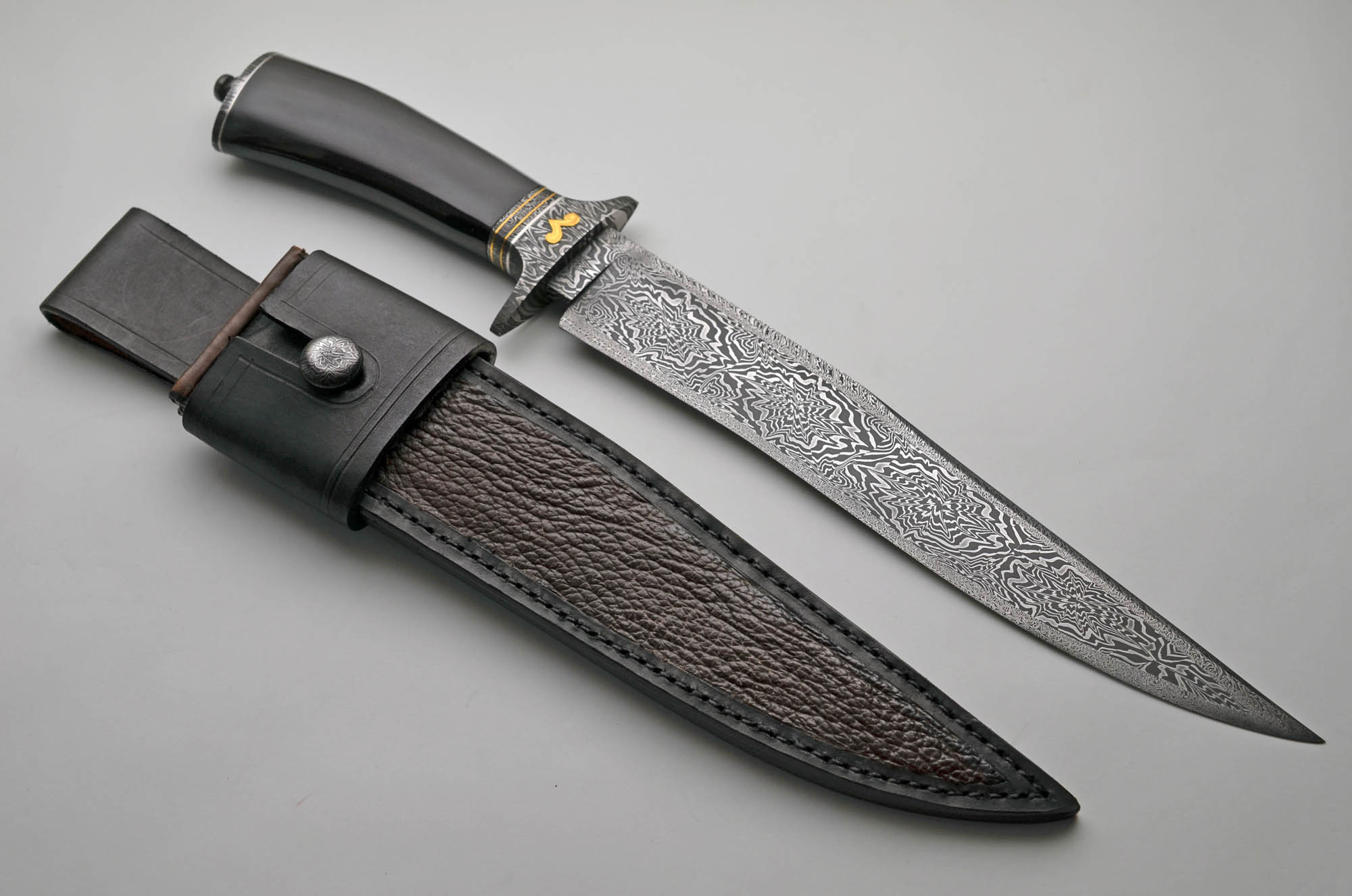 Complex Montenegro Fighter in Mosaic Damascus and Buffalo Horn. The incredible blade is approx. 10.5″, OAL is approx. 16″! Mosaic guard, ferrules and butt with some Gold. Take Down design with tool and well made sheath with Damascus Frog. This piece has it all and is priced right.